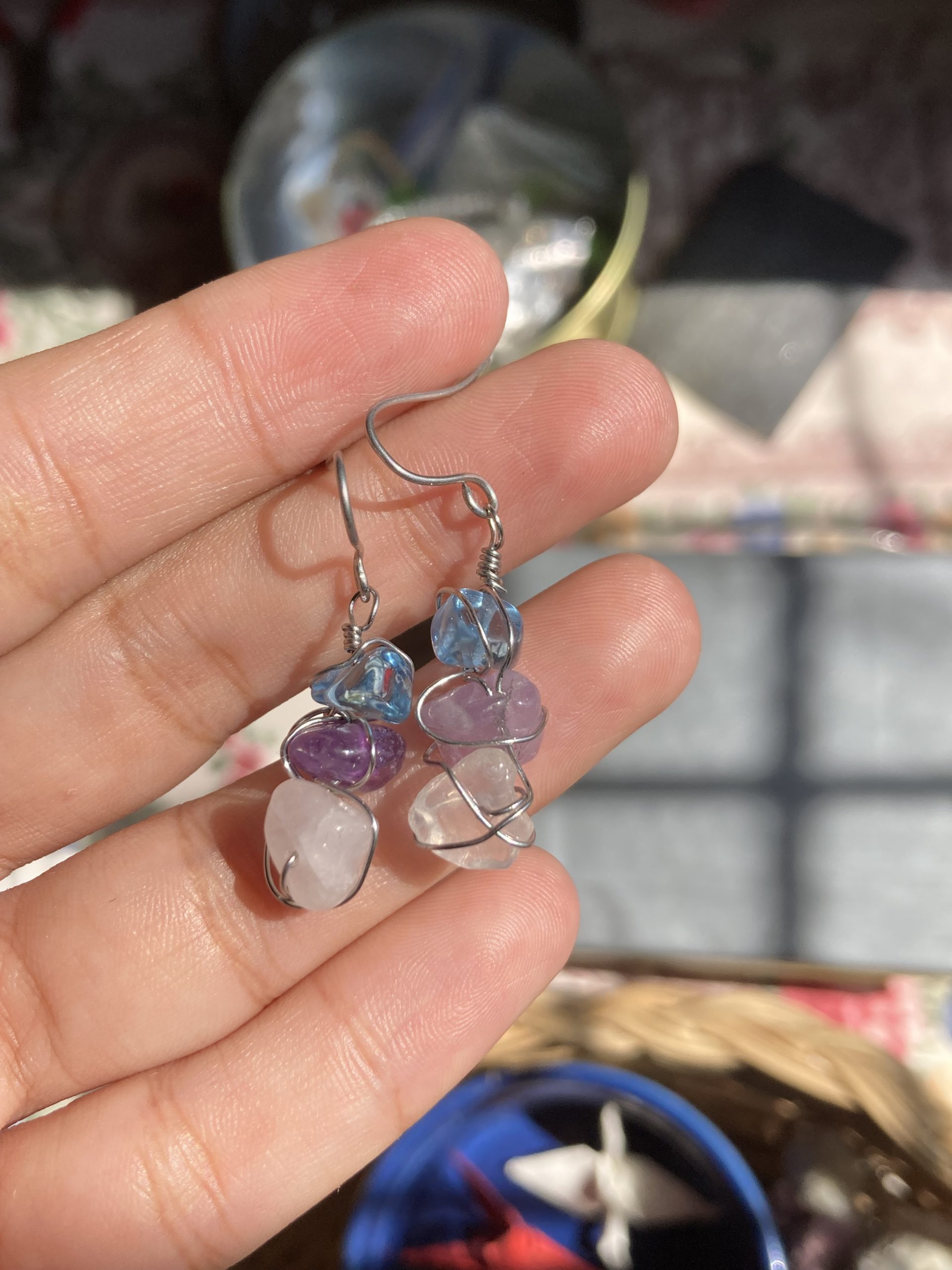 Non tarnish, stainless steel, stones: Amethyst, Flourite, Rose quartz